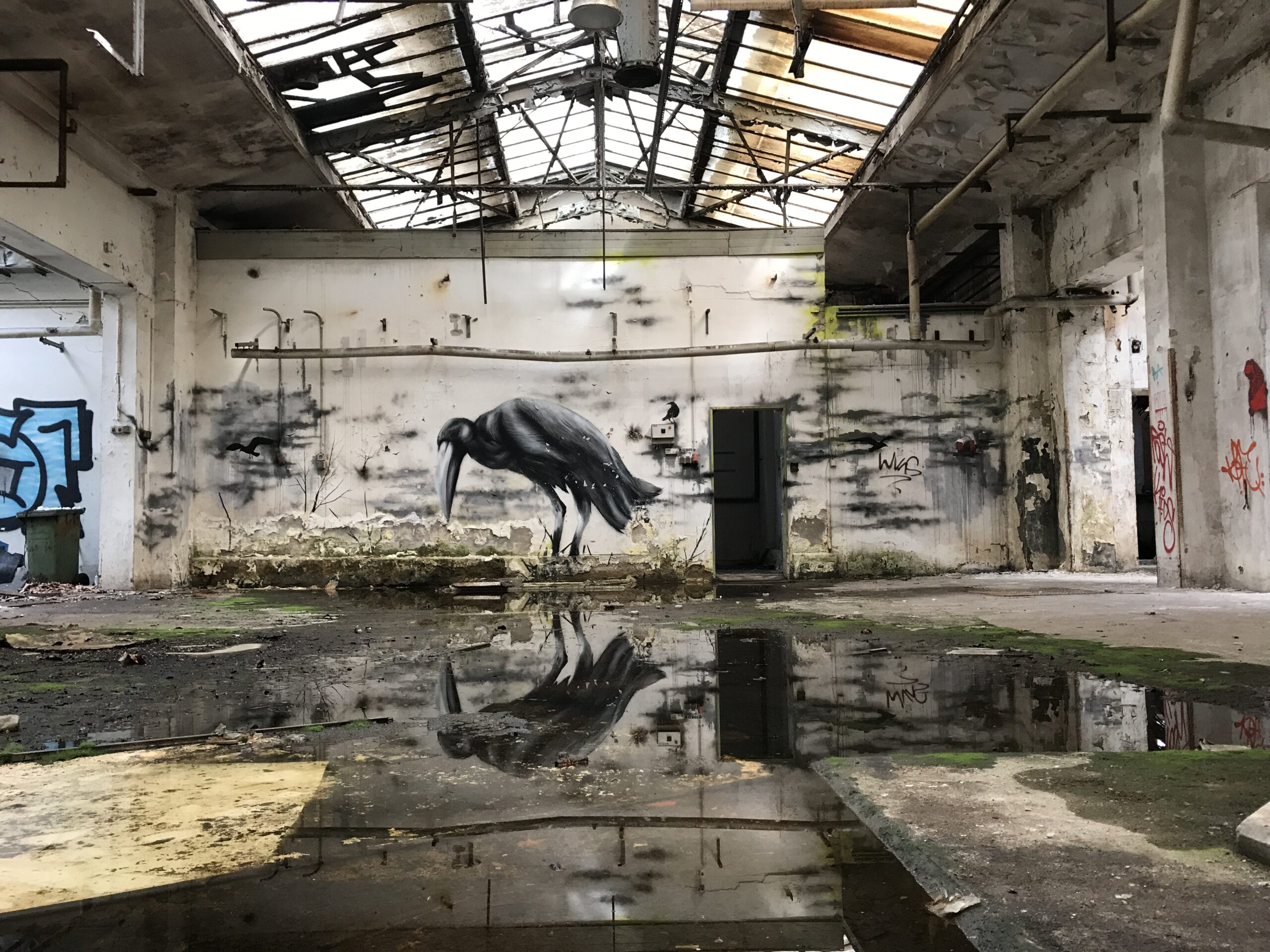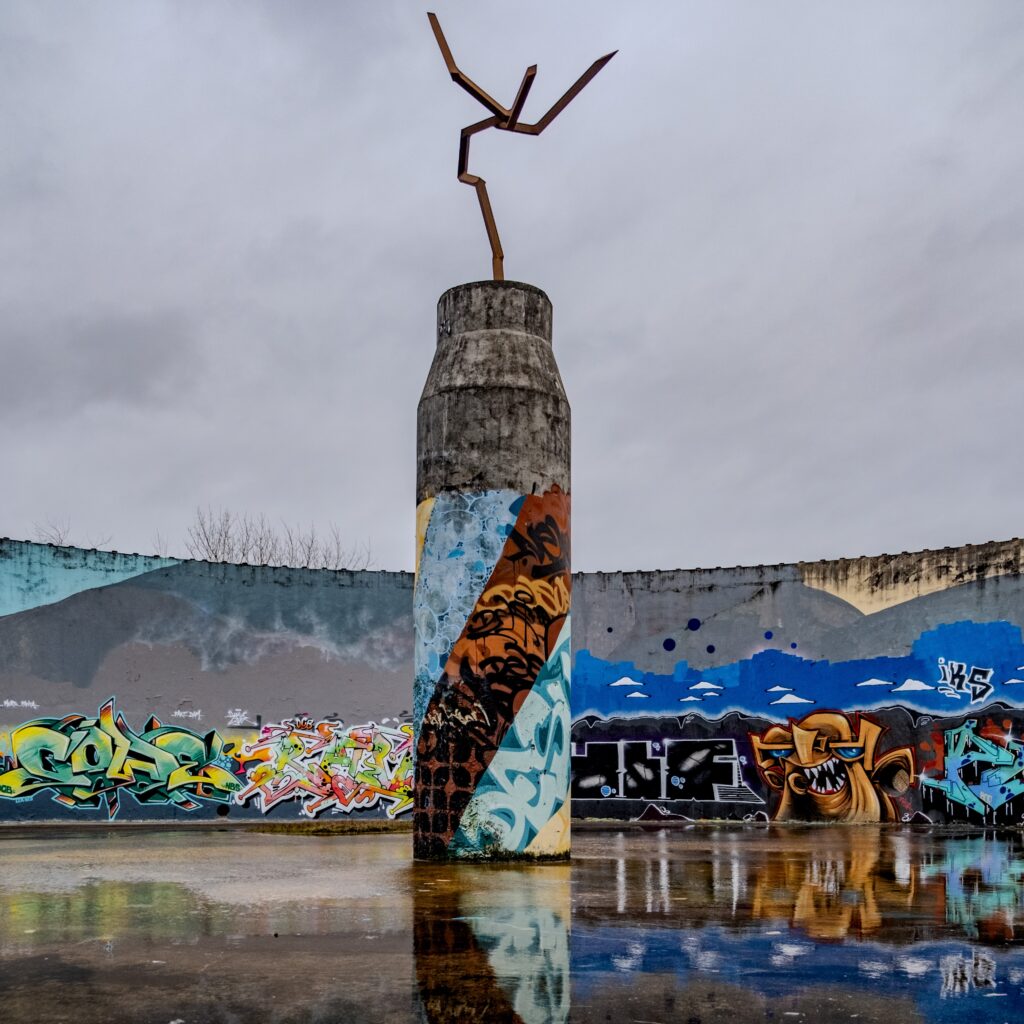 360° Graffiti im ehemaligen Schlämmbottich mit der Skulptur „Fönx“ von Robert Schad