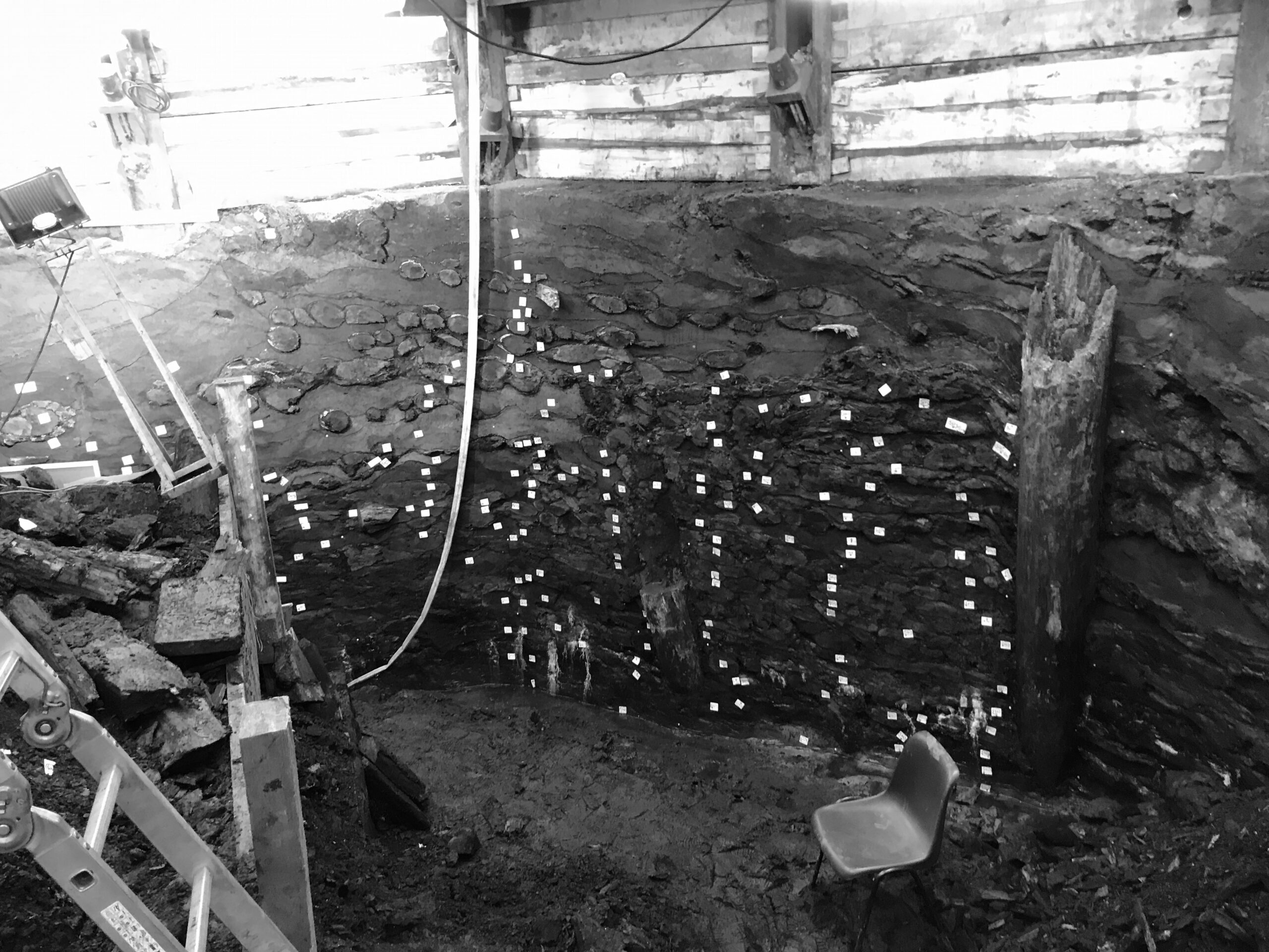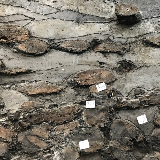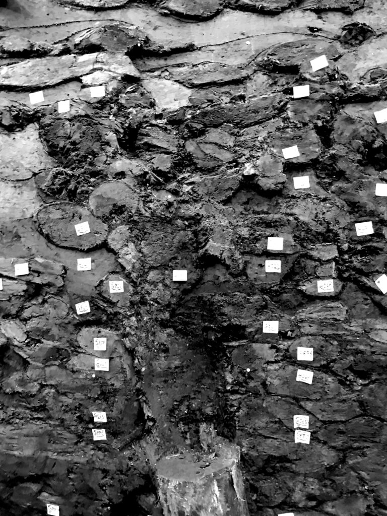 Detail des Profils mit zahlreichen kleinen Holzstämmen im Schnitt und dem Rest eines vertikalen Holzpfahls aus dem 19 Jhd.
