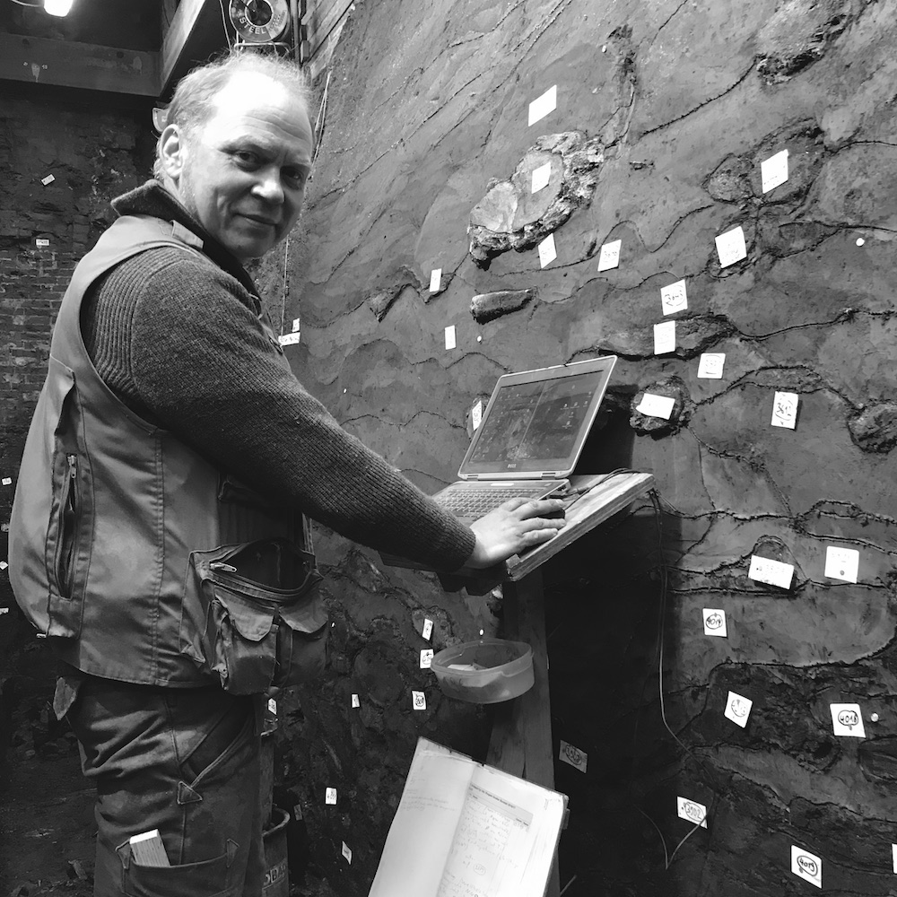 Kay-Peter Suchowa vor dem Wallprofil der Neuen Burg Ausgrabung 2017