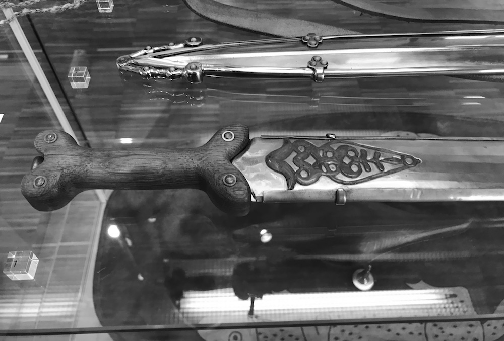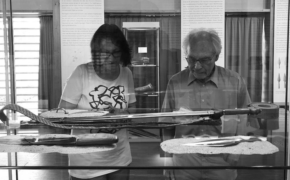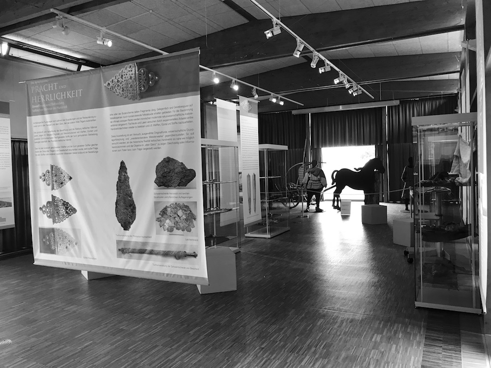 Es geht in der Ausstellung tatsächlich nur um Männer – keltische Männer und wie sie sich im Leben und im Tod ausgestattet haben. Schwerter, Schilde, Messer, Gürtelschnallen, Fibeln, Schmuckscheiben, Trinkhorn, Kleidung… auch ein Toilettenbesteck damit die Ohren sauber, und die Fingernägel ordentlich geschnitten sind.