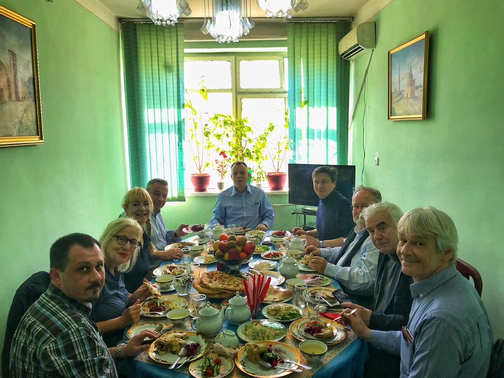 Die deutsche Delegation beim Essen in Daşoguz (v. l. ): Dr. Anton Gass (SPK-Berlin), Barbara Fleckenstein, Dr. Susanne Wiechert (REM), Prof. Matthias Wemhoff (SPK-Berlin), Dr. Michael Merkel (AMH), Prof. Rainer-Maria Weiss, Prof. Alfried Wieczorek (REM), Prof. Hanno Schaumburg und Dr. Manfred Nawroth (SPK-Berlin)