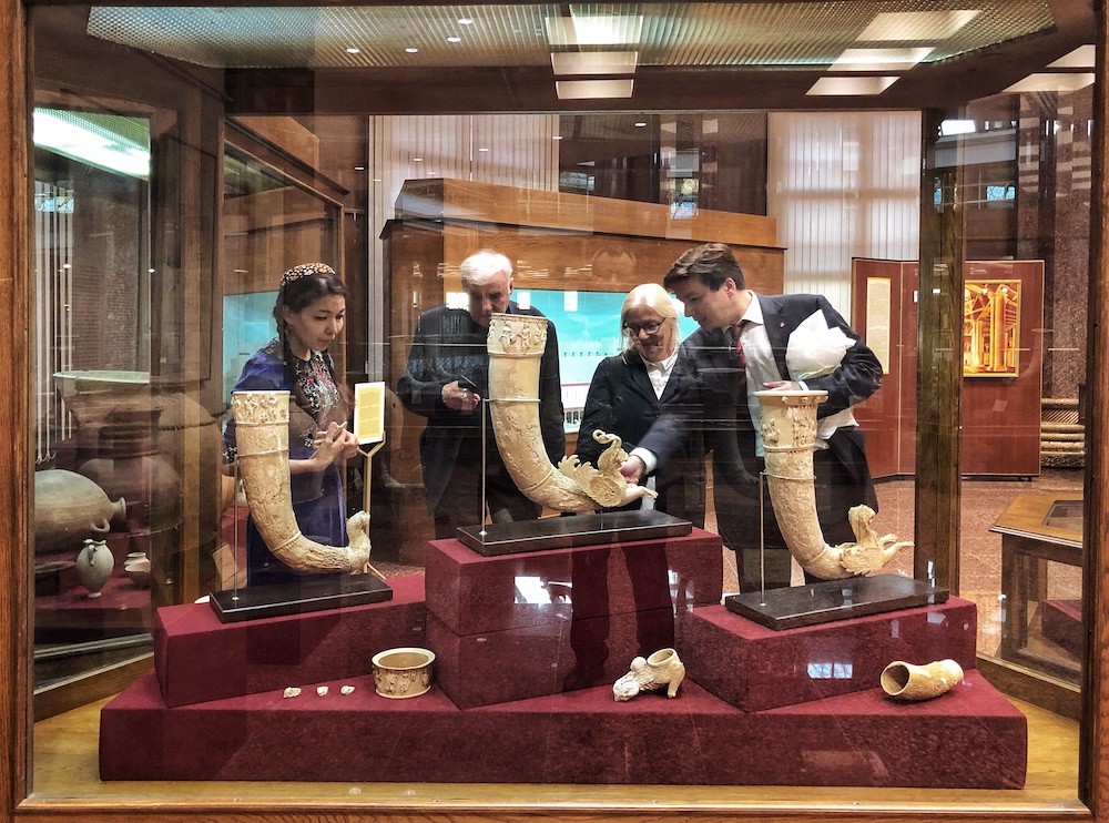Elfenbein-Rhyta, rituelle Trinkhörner, aus Alt Nisa. Im Hintergrund Prof. Weiss, Prof. Schaumburg, Frau B. Fleckenstein bei einer Führung durch das NationalmuseumRekonstruierte Lehmziegelarchitektur in Alt Nisa