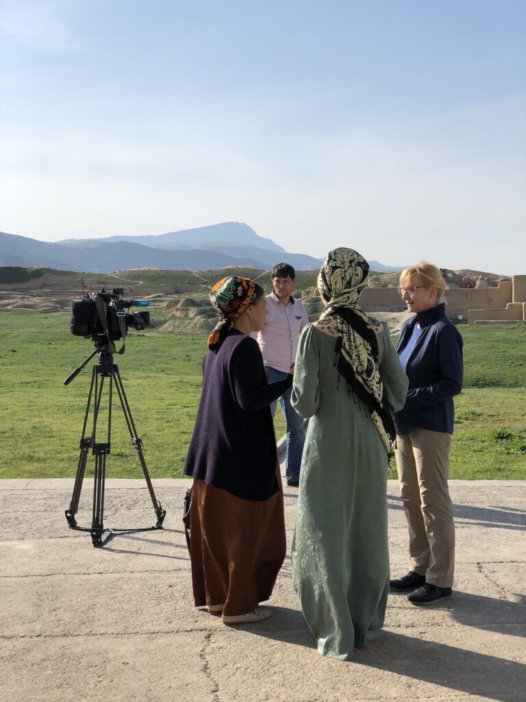 Zusammen mit sieben Kollegen aus dem Neuen Museum Berlin und den Reiss-Engelhorn-Museen machten sich Prof. Weiss und ich am 11. März 2019 auf den Weg. Es erwartete uns für die kommenden fünf Tage ein volles und vielfältiges Programm: Wir trafen mit Direktoren der Staatlichen Museen Turkmenistans und Studenten zusammen und wohnten einem Theaterstück bei, wir besichtigten Museen in Aşgabat und besuchten zwei archäologische Fundstätten, noch einmal eine Tagesreise entfernt. Zum einen Alt-Nisa, die Hauptstadt des Parther-Reichs, die bereits von weitem noch als beindruckende Befestigungsanlage zu erkennen ist. Zum anderen besuchten wir die Reste der mittelalterlichen Stadt Köneürgenç. Sie liegt am Rande der Wüste Karakum unweitder Grenze zu Usbekistan. Die kaum erforschten Überreste dieser mittelalterlichen Metropole wurden 2005 von der UNESCO zum Weltkulturerbe erklärt.